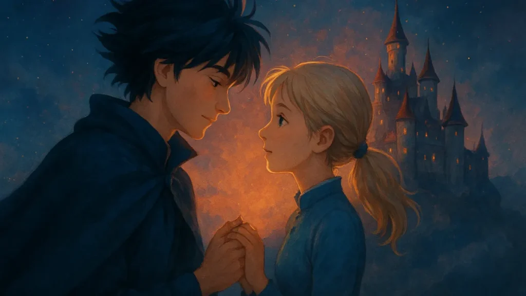 O romance em Castelo Animado: Romance mágico de Howl e Sophie de Miyazaki não depende apenas de declarações dramáticas. Ele cresce em gestos e transformações. Isso deixa a relação mais crível e comovente.