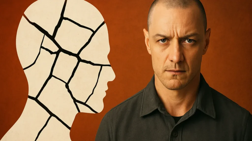 McAvoy usa mudanças sutis. Não é só alterar voz. É respiração, olhar, gestos pequenos que anunciam quem assumiu o controle.
